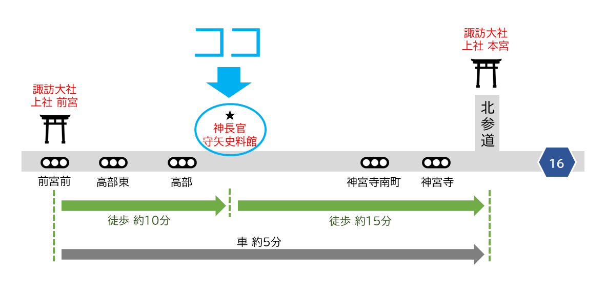 神長官守矢史料館は前宮から徒歩10分ほど、本宮からは徒歩15分ほどの場所にあります。