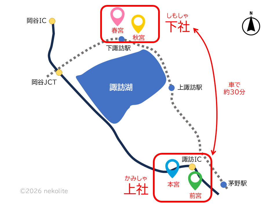 下社と上社は車で約30分離れているため、4社すべてをじっくり巡る場合は4-5時間ほど予定しておくと良いです。
