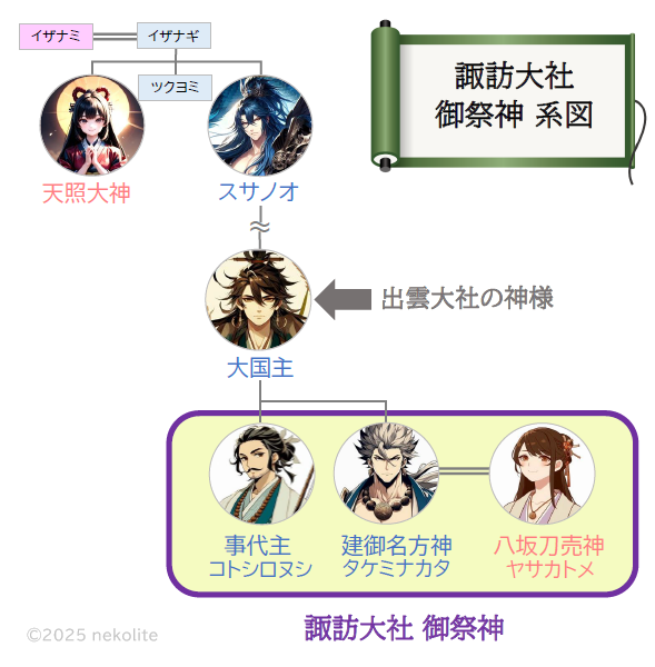 この「3柱の神様は一体何者?」という疑問を、わかりやすく系図で解説しますね。